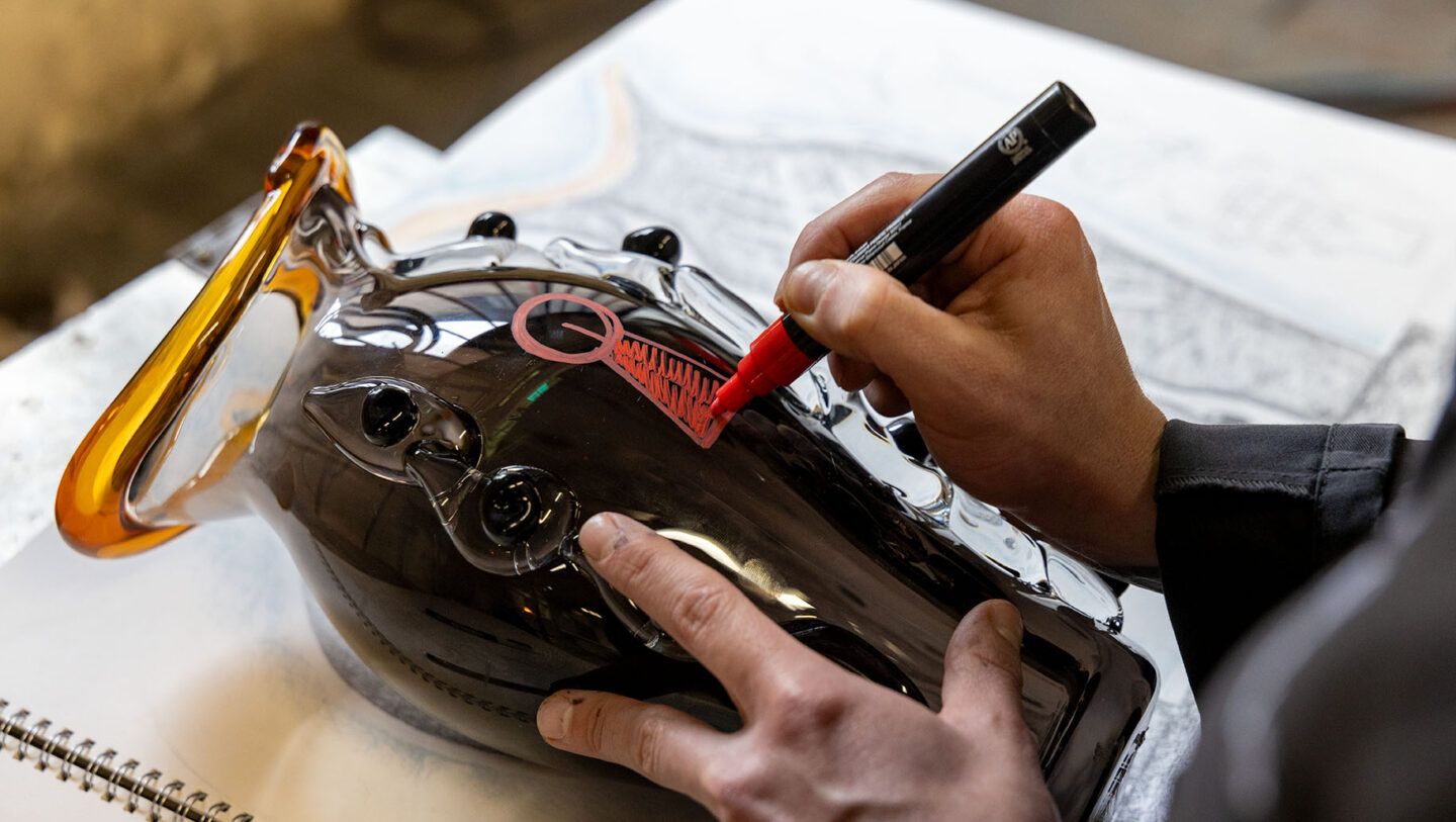 Avec le cycle de résidences Passé Présent Futur, elle a poursuivi cette réflexion en interrogeant le rapport au temps propre à l’artisanat et à la création artistique, à travers la démarche de quatre artistes. Qu’ils explorent les métiers du cuir, de la soie, ou du cristal, ces artistes ont déplacé leurs pratiques respectives, expérimenté des savoir-faire qui leur étaient inconnus – en en repoussant parfois les limites – pour aboutir à des œuvres originales. Parmi elleux, l’artiste italien Jacopo Pagin a été accueilli au sein de la cristallerie Saint-Louis, en Moselle.