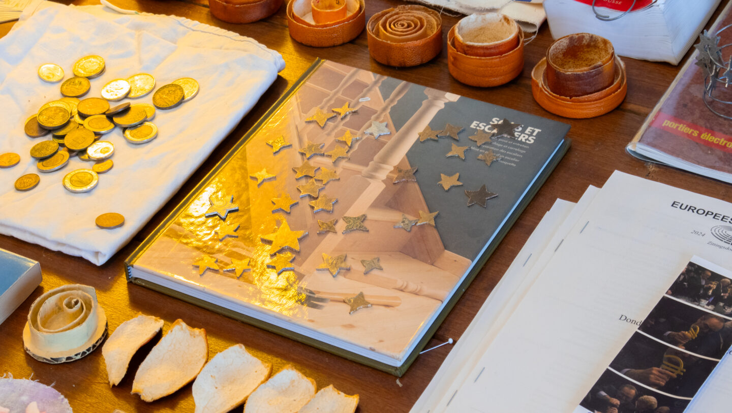 De janvier à mars 2025, il est en résidence à basis e.V. (Francfort, DE), où il expérimente ce qu’il appelle le “tourisme financier” sans pour autant parvenir à dépasser les portiques des halls de banques. De cette expérience naît Skulpturen für Bankhallen, une exposition mêlant mécanismes automatisés, maquettes et scrapbooks, élaborée à partir de son arpentage de l’architecture et du mobilier des institutions économiques de la ville. En janvier 2026, il poursuit ce travail à Strasbourg à l’occasion d’une résidence de recherche et de production qu’il passe en partie à enquêter à l’intérieur du Parlement européen.